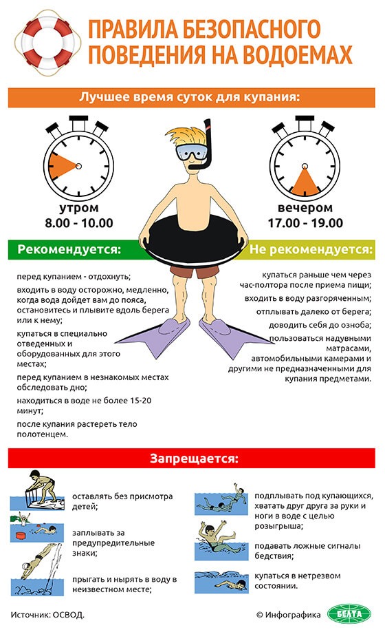 Не игнорируйте правила поведения на воде и не разрешайте делать это детям. Не купайтесь с ними в местах, где это запрещено. Не заплывайте за буйки, не прыгайте в воду со скал или в местах с неизвестным дном. Старайтесь держать ребенка в поле своего зрения, когда он находится в воде. Для детей, которые плохо плавают, применяйте специальные средства безопасности, надувные нарукавники или жилеты. Строго контролируйте нахождения ребенка в воде, чтобы избежать переохлаждения. После купания в соленой воде необходимо помыться пресной.