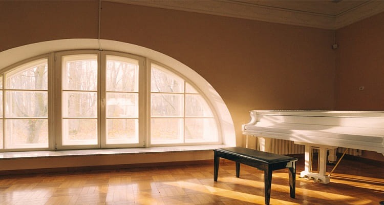 Над пилястрами, между капителями, располагаются окошки мезонинного этажа, по которому перемещались музыканты и прислуга. Продолжались боковые крылья главного фасада одноэтажными снаружи корпусами, завершавшимися квадратными 2-х этажными павильонами с полуциркульными окнами и небольшими оконными проемами в мезонинном этаже.