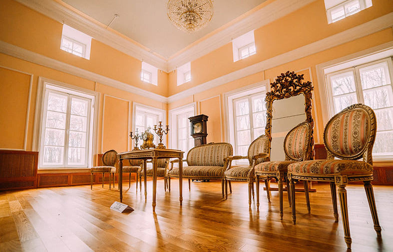 Жилые комнаты и хозяйственные помещения располагались на первом этаже главного корпуса, что было традиционным решением, окна первого этажа — прямоугольные, небольшие. Окна второго этажа — большие, расчлененные пилястрами. Все фасады богато украшены цветочными гирляндами. Второй этаж являлся парадным, предназначался для проведения торжественных мероприятий.